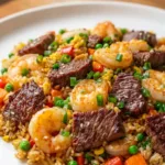 A delightful, savory fried rice dish featuring shrimp and steak, perfect for impressing guests or enjoying a casual meal.