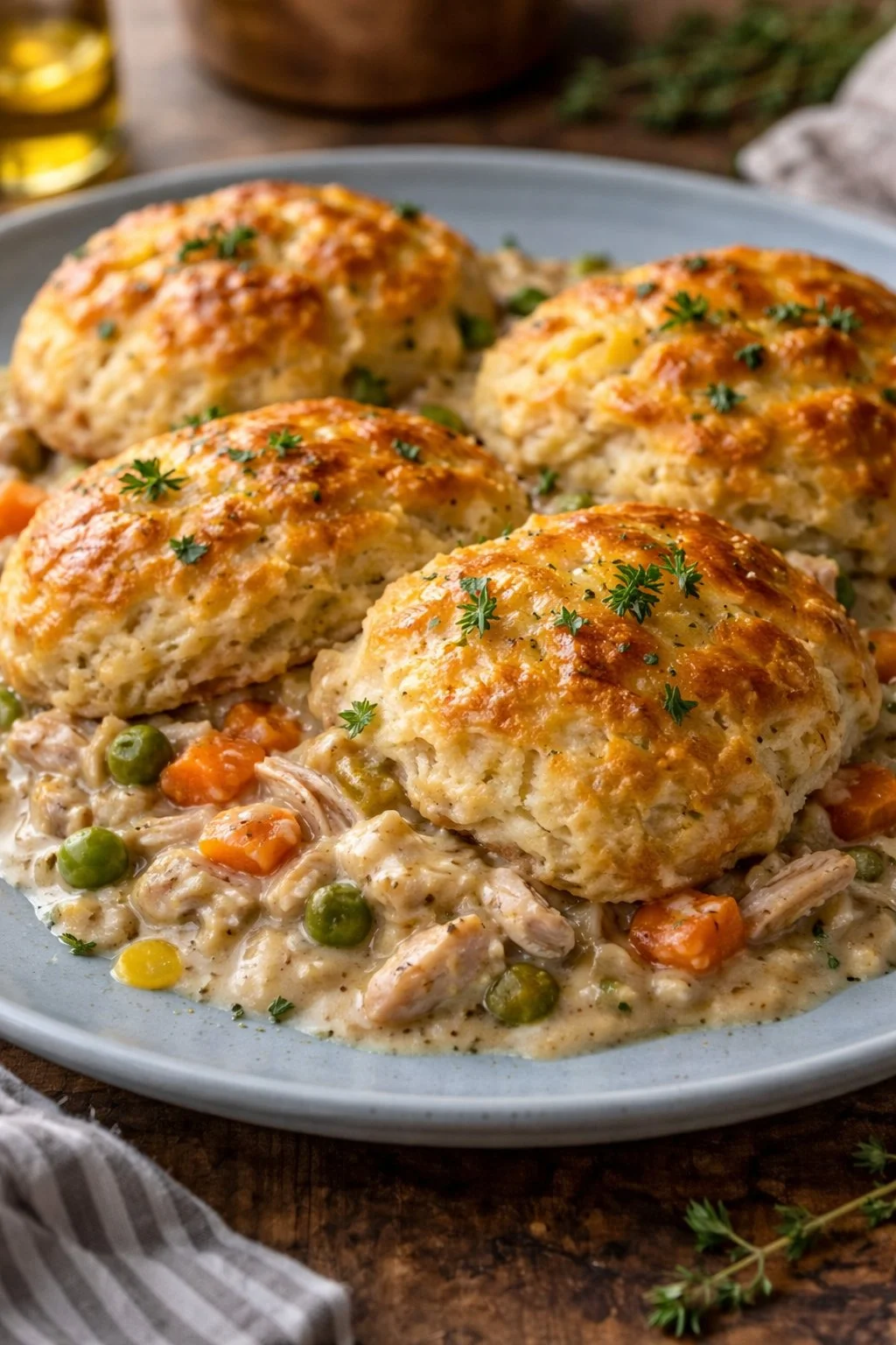 This comforting casserole features a creamy chicken filling with a golden biscuit topping, perfect for busy weeknight dinners or family gatherings.