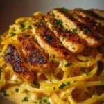 - Add the cooked linguine to the sauce and toss to coat. Stir in fresh spinach until wilted. Plate the pasta, top with sliced Cajun chicken, garnish with parsley, and serve.