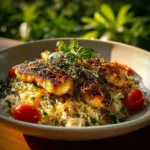 A delightful dish featuring tender chicken in a zesty garlic white wine sauce served over creamy garlic Parmesan rice.