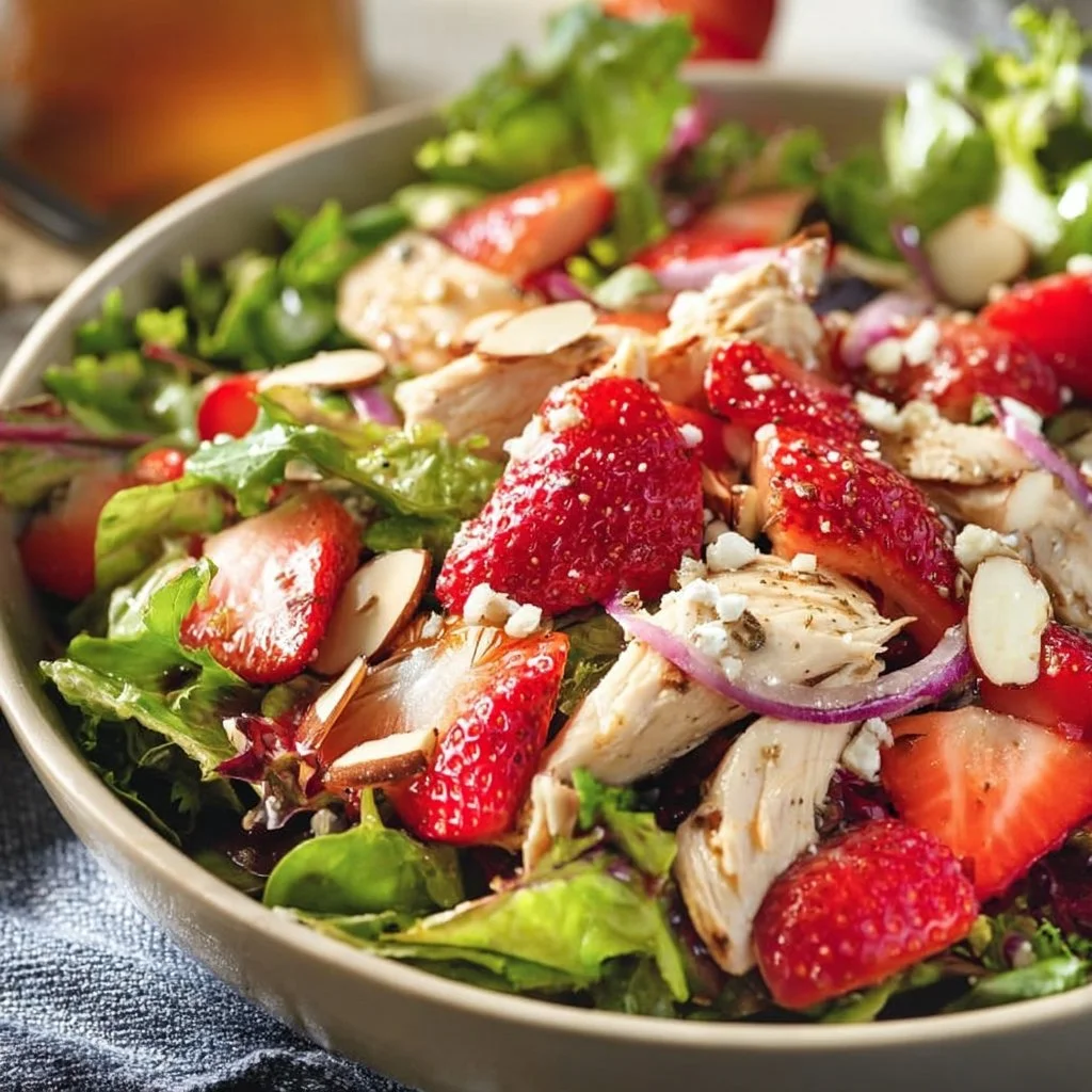 A delightful salad combining savory rotisserie chicken and sweet strawberries, perfect for a light yet filling meal.